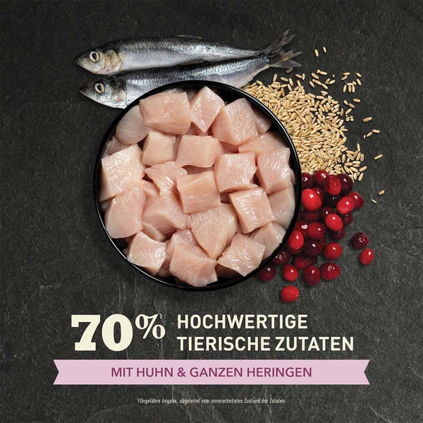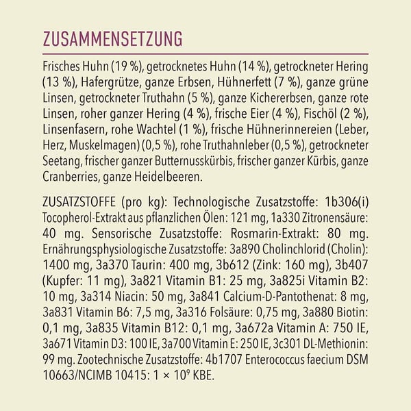 Frisches Huhn (19 %), getrocknetes Huhn (14 %), getrockneter Hering (13 %), Hafergrütze, ganze Erbsen, Hühnerfett (7 %), ganze grüne Linsen, getrockneter Truthahn (5 %), ganze Kichererbsen, ganze rote Linsen, roher ganzer Hering (4 %), frische Eier (4 %), Fischöl (2 %), Linsenfasern, rohe Wachtel (1 %), frische Hühnerinnereien (Leber, Herz, Muskelmagen) (0,5 %), rohe Truthahnleber (0,5 %), getrockneter Seetang, frischer ganzer Butternusskürbis, frischer ganzer Kürbis, ganze Cranberries, ganze Heidelbeeren