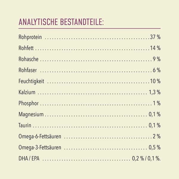 Analytische Bestandteile:Rohprotein 37 %, Rohfett 18 %, Rohasche 10 %, Rohfaser 4 %, Feuchtigkeit 10 %, Kalzium 1,4 %, Phosphor 1,1 %, Magnesium 0,1 %, Taurin 0,1 %, Omega-6-FA 2,8 %, Omega-3-FA 0,9 %, DHA / EPA 0,2 % / 0,15 %