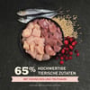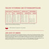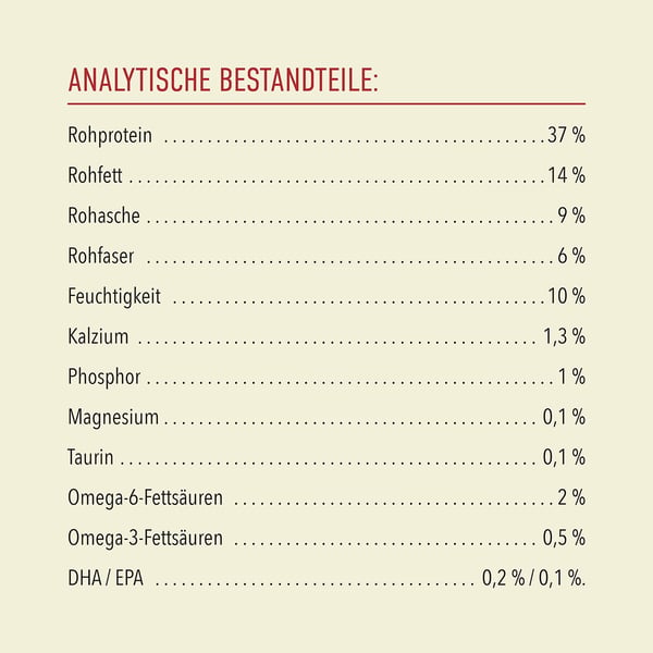 Analytische Bestandteile:Rohprotein 37 %, Rohfett 14 %, Rohasche 9 %, Rohfaser 6 %, Feuchtigkeit 10 %, Kalzium 1,3 %, Phosphor 1 %, Magnesium 0,1 %, Taurin 0,1 %, Omega-6-FA 2 %, Omega-3-FA 0,5 %, DHA / EPA 0,2 % / 0,1 %