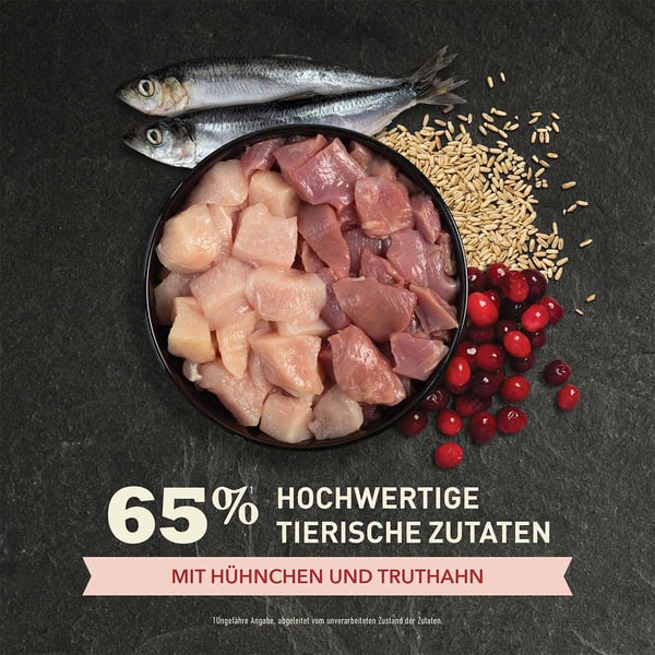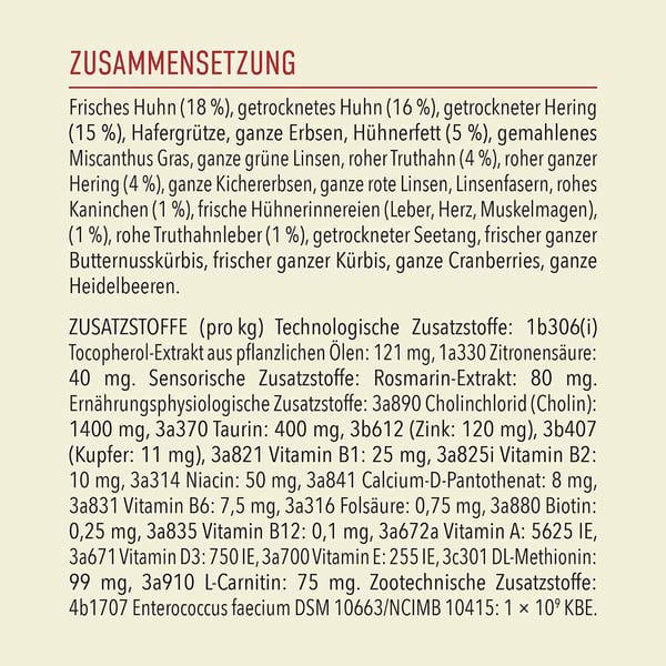 Frisches Huhn (18 %), getrocknetes Huhn (16 %), getrockneter Hering (15 %), Hafergrütze, ganze Erbsen, Hühnerfett (5 %), gemahlenes Miscanthus Gras, ganze grüne Linsen, roher Truthahn (4 %), roher ganzer Hering (4 %), ganze Kichererbsen, ganze rote Linsen, Linsenfasern, rohes Kaninchen (1 %), frische Hühnerinnereien (Leber, Herz, Muskelmagen) (1 %), rohe Truthahnleber (1 %), getrockneter Seetang, frischer ganzer Butternusskürbis, frischer ganzer Kürbis, ganze Cranberries, ganze Heidelbeeren.