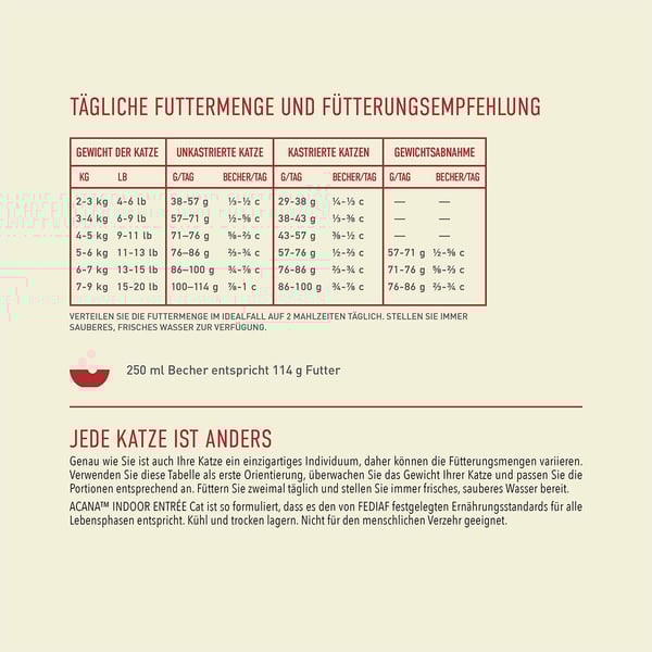 ACANA Cat Indoor Entrée ist perfekt auf die Bedürfnisse von Katzen abgestimmt, die hauptsächlich im Haus leben. Der ausgewogene Kaloriengehalt hilft, ein gesundes Gewicht zu halten, während die hochwertigen Zutaten deine Katze mit allen wichtigen Nährstoffen versorgen. Genieße die Gewissheit, dass deine Katze mit dieser Ernährung in bester Form bleibt.