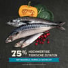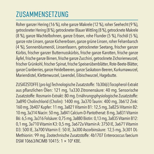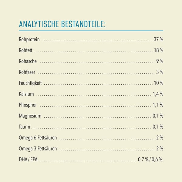 Analytische Bestandteile:Rohprotein 37 %, Rohfett 18 %, Rohasche 9 %, Rohfaser 3 %, Feuchtigkeit 10 %, Kalzium 1,4 %, Phosphor 1,1 %, Magnesium 0,1 %, Taurin 0,1 %, Omega-6-FA 2 %, Omega-3-FA 0,9 %, DHA / EPA 0,7 % / 0,6 %