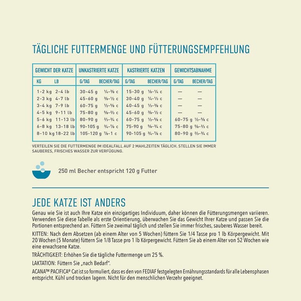 ACANA Cat Pacifica enthält eine Kombination aus Präbiotika und Ballaststoffen, die die Verdauung deiner Katze unterstützen. Diese Zusammensetzung sorgt dafür, dass deine Katze die nötigen Nährstoffe optimal aufnehmen kann. Das Futter ist für junge und ausgewachsene Katzen geeignet und bietet eine vollwertige Ernährung, die deine Katze zufrieden und kräftig hält.