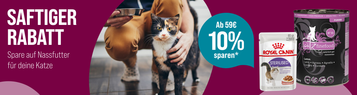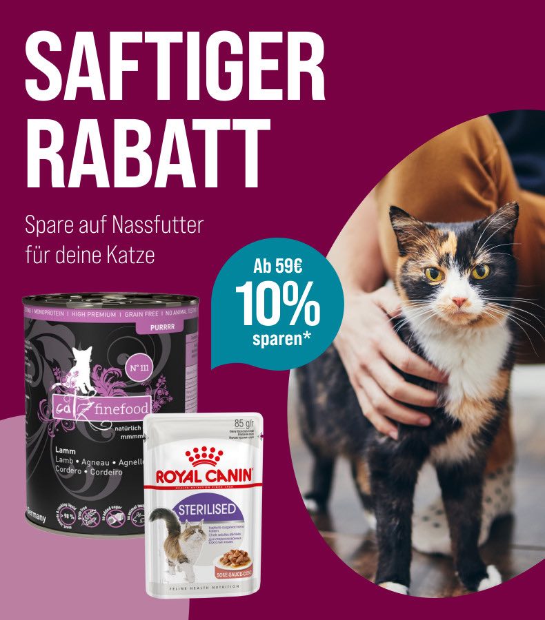 *Gültig vom 15.07.2024 bis 28.07.2024. 10% Rabatt auf Nassfutter ab einem Einkaufswert von 59€ mit dem Code NaFu_HuK2024. Nur solange der Vorrat reicht. Nur ein Gutscheincode pro Bestellung einlösbar. Gilt nur im ZooRoyal Online-Shop und nicht in den ZooRoyal Fachmärkten.