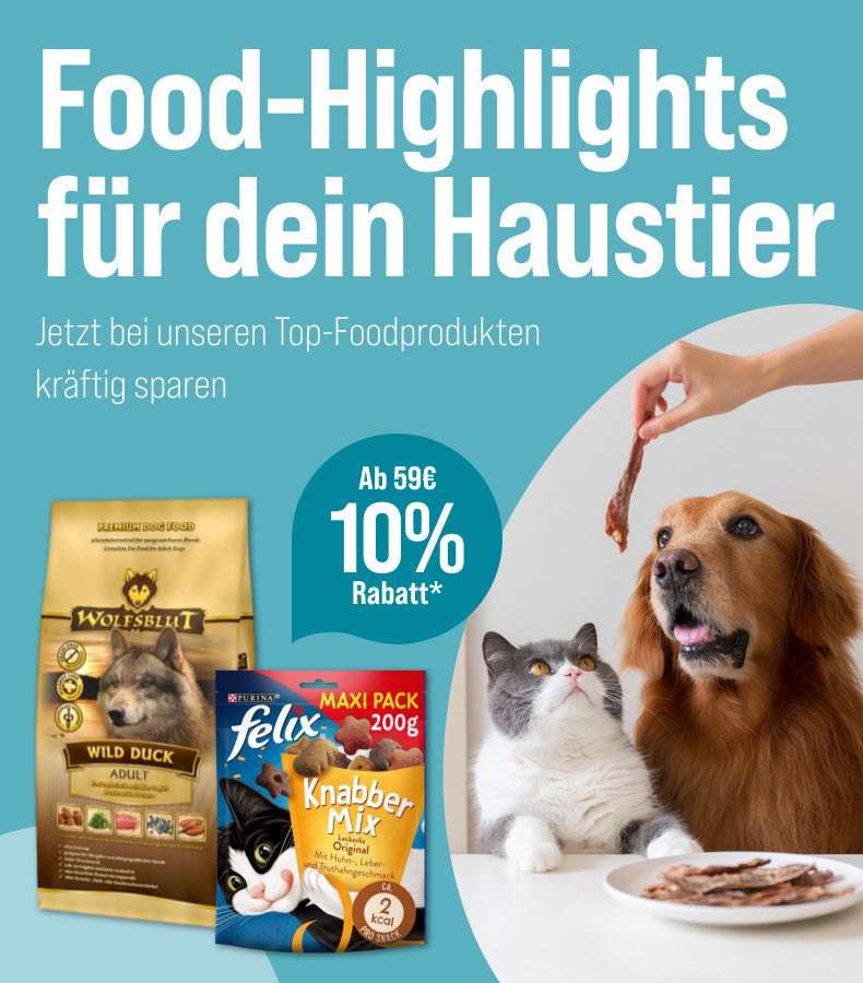 *Gültig vom 05.08.2024 bis 11.08.2024. Das Angebot gilt nur auf ausgewählte Produkte auf unserer Aktionsseite. Nur solange der Vorrat reicht. 10% Rabatt ab einem Einkaufswert von 59€ mit dem Code TopFutter. Nur ein Gutscheincode pro Bestellung einlösbar. Gilt nur im ZooRoyal Online-Shop und nicht in den ZooRoyal Fachmärkten.