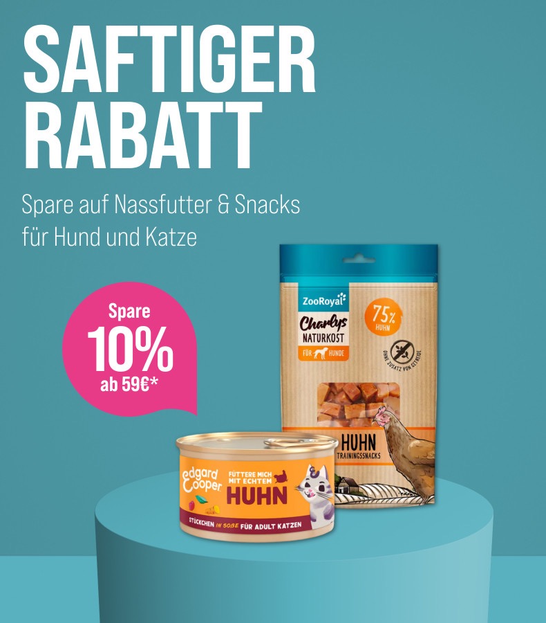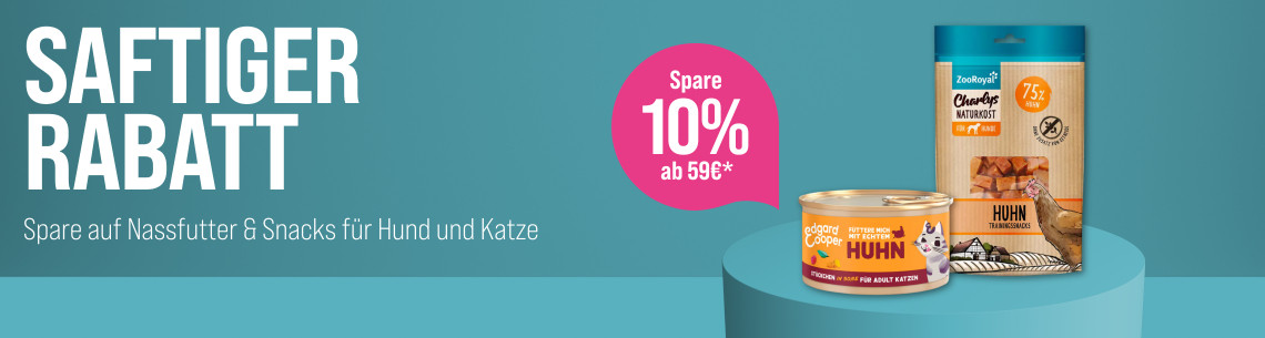 *Gültig vom 16.09.2024 bis 22.09.2024. Nur solange der Vorrat reicht. 10% Rabatt ab einem Einkauswert von 59€ mit dem Code nass24. Nur ein Gutscheincode pro Bestellung einlösbar. Gilt nur im ZooRoyal Online-Shop und nicht in den ZooRoyal Fachmärkten. Gilt nicht auf die Marke ja! und VET-Diäten.