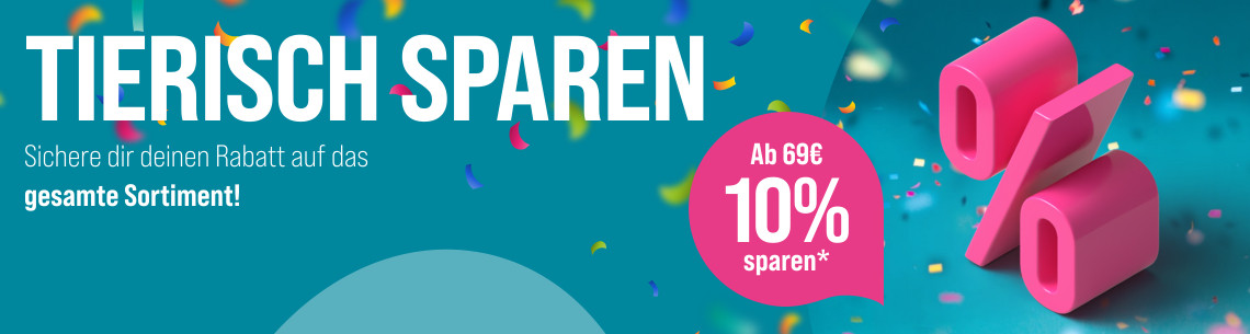 *Gültig vom 22.07.2024 bis 24.07.2024. Nur solange der Vorrat reicht. 10% Rabatt ab einem Einkaufswert von 69€ mit dem Code 10Prozent. Nur ein Gutscheincode pro Bestellung einlösbar. Gilt nur im ZooRoyal Online-Shop und nicht in den ZooRoyal Fachmärkten. Gilt nicht auf die Marke ja!, VET-Diäten und Aquarien.