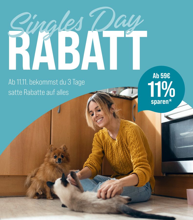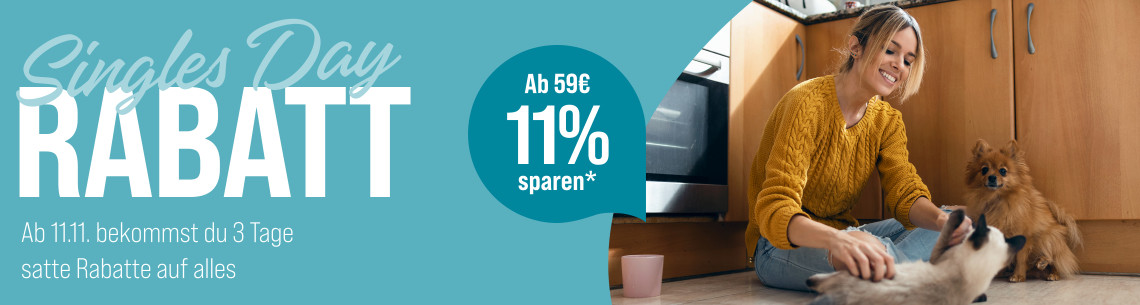 *Gültig vom 11.11.2024 bis 13.11.2024. 11% Rabatt ab 59€ mit dem Code SinglesDay. Nur ein Gutscheincode pro Bestellung einlösbar. Gilt nur im ZooRoyal Online-Shop und nicht in den ZooRoyal Fachmärkten. Gilt nicht auf die Marke ja!, VET-Diäten, ZooRoyal Schatzkiste und ausgewählte Produkte im Aquabereich (Aquarien und die Marken Nyos und Ocean Nutrition).