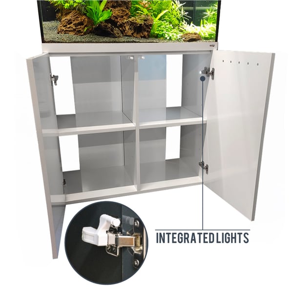 Der Aquarienunterschrank wird als Bausatz komplett mit Aufbauzubehör geliefert. Die beschichteten Spanplatten werden in Hochglanz weiß oder grau geliefert und sind farblich identisch mit der Abdeckleuchte. Alle Bauteile inclusive der Türen und Ablagebretter werden in 19mm Stärke extrastabil gefertigt. Die Türen sind mit professionellen Scharnieren mit Push & Pull Öffnung ausgestattet. Die Schränke sind mit Drucksensoren und Beleuchtung zur vollständigen Ausleuchtung des Schrankinneren ausgestattet. In den Seitenfächern können die beigelegten Einlegeböden höhenverstellbar angebracht werden. Der Einlegeboden in der Mitte ist bei den Modellen Alux 330 und 450 fest verbaut. Die Rückwand besteht aus stabilen 19 mm starken Brettern in Schrankfarbe und bieten Platz für den bequemen Einbau incl. Verrohrung aller gängigen Aussenfilter.