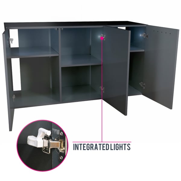Der Aquarienunterschrank wird als Bausatz komplett mit Aufbauzubehör geliefert. Die beschichteten Spanplatten werden in Hochglanz weiß oder grau geliefert und sind farblich identisch mit der Abdeckleuchte. Alle Bauteile inclusive der Türen und Ablagebretter werden in 19mm Stärke extrastabil gefertigt. Die Türen sind mit professionellen Scharnieren mit Push & Pull Öffnung ausgestattet. Die Schränke sind mit Drucksensoren und Beleuchtung zur vollständigen Ausleuchtung des Schrankinneren ausgestattet. In den Seitenfächern können die beigelegten Einlegeböden höhenverstellbar angebracht werden. Der Einlegeboden in der Mitte ist bei den Modellen Alux 330 und 450 fest verbaut. Die Rückwand besteht aus stabilen 19 mm starken Brettern in Schrankfarbe und bieten Platz für den bequemen Einbau incl. Verrohrung aller gängigen Aussenfilter.
