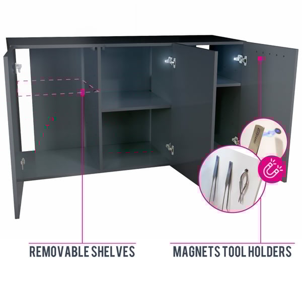 Das besondere an den Alux Schränken ist ihre außergewöhnliche Höhe von 83cm. Dadurch passen selbst die großen Aussenfilter bequem in den Unterschrank und die Schläuche lassen sich knickfrei und anwenderfreundlich verlegen. In der rechten Tür sind 5 kräftige Magnete eingelassen, die Aquarien und Aquascaping Besteck aus Edelstahl sauber aufnehmen.