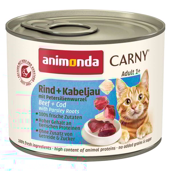 Dieses Nassfutter kann deine Katze mit notwendigen Vitaminen und Mineralstoffen umfassend versorgen. Mit Animonda Katze Carny Adult Rind, Kabeljau & Petersilienwurzeln füllst du ein qualitativ hochwertiges Futter in den Napf. Das Futter ist für Katzen aller Größen zu empfehlen sowie speziell auf die Bedürfnisse von erwachsenen Katzen angepasst. Für genügend Energie im Alltag sorgt der hohe Fleischanteil der deinem Liebling mit Aminosäuren beliefert. Aktive Katzen haben einen erhöhten Energiebedarf. Dieses proteinreiche Katzenfutter kann deinen Hund mit dem benötigten Eiweiß versorgen. Das enthaltene Herz ist Natur aus ein muskulaturreiches Organ, dass viel hochwertiges Protein liefert. Ein vitales und starkes Katzenleben wird durch die beigefügten Vitamine begünstigt. Um einen gesunden Knochenaufbau zu fördern, ist ein ausgewogenes Calcium-Phosphor-Verhältnis von großer Bedeutung. Auf die Zugabe von Zucker, Farbstoffen und Konservierungsmitteln wird bewusst verzichtet.