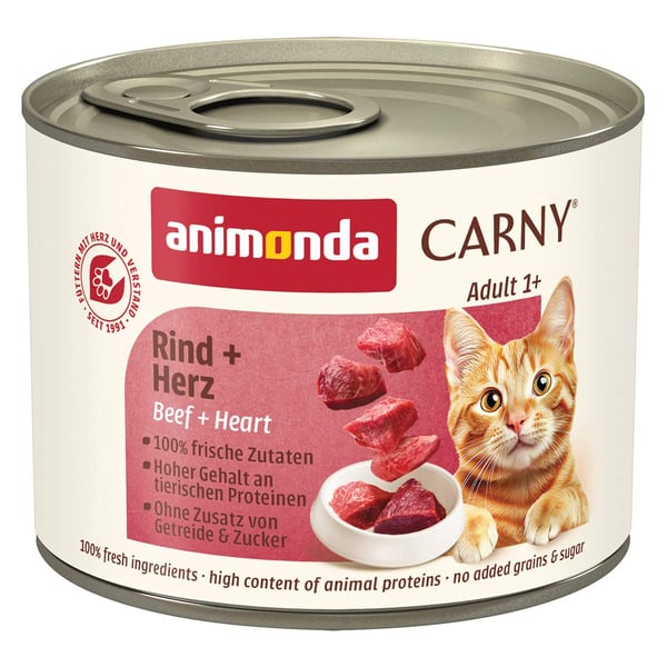 Dieses zuckerfreie Nassfutter bietet deiner Katze eine ausgewogene Mahlzeit. Die richtige Wahl für ein qualitativ hochwertiges Futter triffst du mit Animonda Katzen-Nassfutter Carny Adult Rind und Herz. Das Futter ist speziell auf die Bedürfnisse von ausgewachsenen Katzen angepasst. Dieses proteinreiche Katzenfutter eignet sich vor allem, um den Eiweiß- und Energiebedarf einer aktiven Katze abzudecken. Zusätzlich liefert das enthaltene Herz viel hochwertiges Protein. Die beigefügten Vitamine können die Vitalität sowie die Gesundheit deiner Katze fördern. Mithilfe eines ausgewogenen Calcium-Phosphor-Verhältnis kann zu einer gesunden Knochenentwicklung beigetragen werden. Es wird bewusst auf die Zugabe von Zucker verzichtet.
