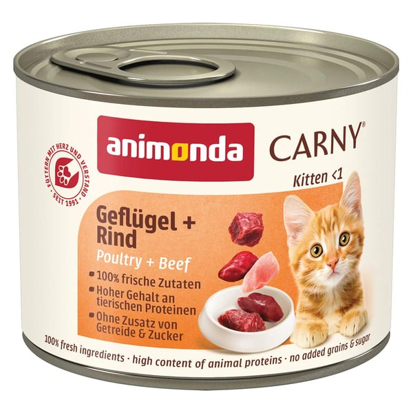 Animonda Carny Kitten Geflügel und Rind – aus frischen fleischlichen Rohstoffen – steht für ausgewogene, leckere, gesunde Ernährung auf höchstem Niveau für wachsende Katzen im ersten Lebensjahr. Katzenkinder entwickeln sehr früh ihre ersten geschmacklichen Vorlieben. Carny Kitten mit den leckeren, kätzchengerechten, kleinen fleischigen Stückchen ist speziell abgestimmt auf die Nährstoffansprüche wachsender Katzen.