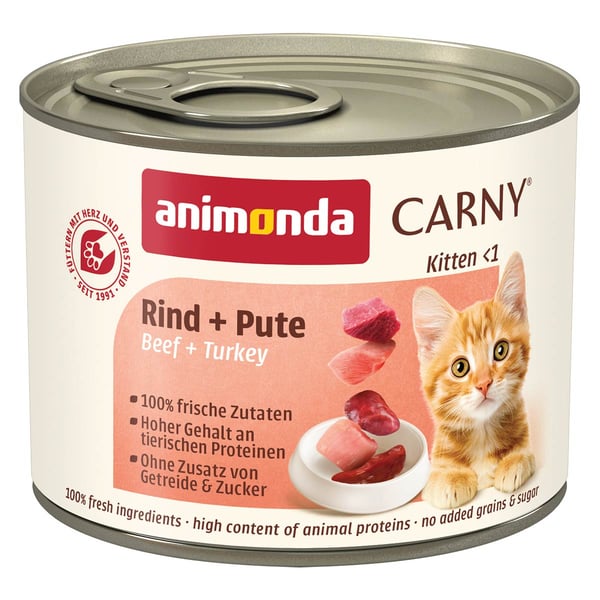 Animonda Carny Kitten mit Rind und Pute – aus frischen fleischlichen Rohstoffen – steht für ausgewogene, leckere, gesunde Ernährung auf höchstem Niveau für wachsende Katzen im ersten Lebensjahr. Katzenkinder entwickeln sehr früh ihre ersten geschmacklichen Vorlieben. Carny Kitten mit den leckeren, kätzchengerechten, kleinen fleischigen Stückchen ist speziell abgestimmt auf die Nährstoffansprüche wachsender Katzen.