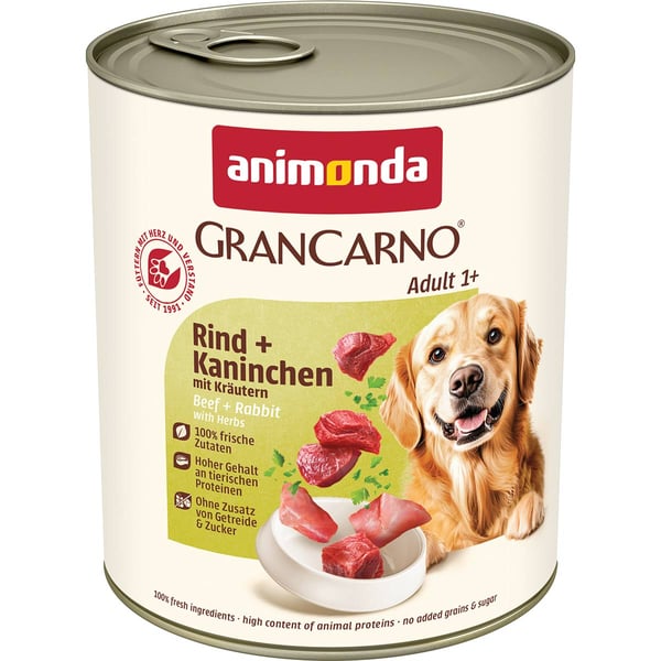 Dieses sojafreie Nassfutter bietet deinem Hund eine ausgewogene Mahlzeit. Animonda Hunde-Nassfutter GranCarno Adult Rind und Kaninchen mit Kräutern ist ein erstklassiges Futter. Das Futter ist speziell auf die Bedürfnisse von erwachsenen Hunden angepasst. Für ein aktives Hundeleben ist dieses proteinreiche Hundefutter besonders geeignet, um den Eiweiß- und Energiebedarf zu decken. Eine zusätzliche Eiweißzufuhr erhält dein Tier durch das enthaltene Herz. Ein vitales und starkes Hundeleben wird durch die beigefügten Vitamine begünstigt. Auf die Zugabe von Soja, Farbstoffen und künstlichen Geschmacksverstärkern wird bewusst verzichtet.