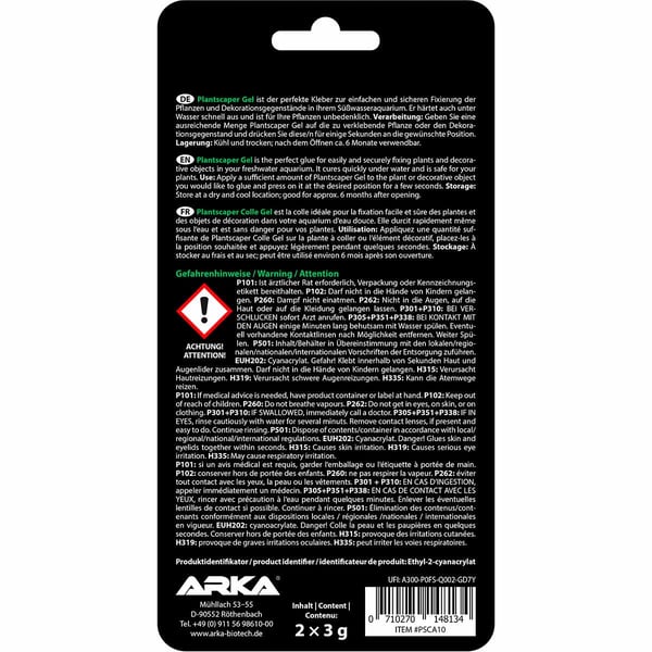 Mit ARKA Plantscaper Gel kannst du Pflanzen und Dekorationsgegenstände in deinem Süßwasseraquarium schnell und sicher fixieren. Der hohe Cyanacrylat-Anteil sorgt für maximale Klebkraft und eine schnelle Aushärtung, auch unter Wasser. So bleibt alles an seinem Platz, ohne dass du lange warten musst.