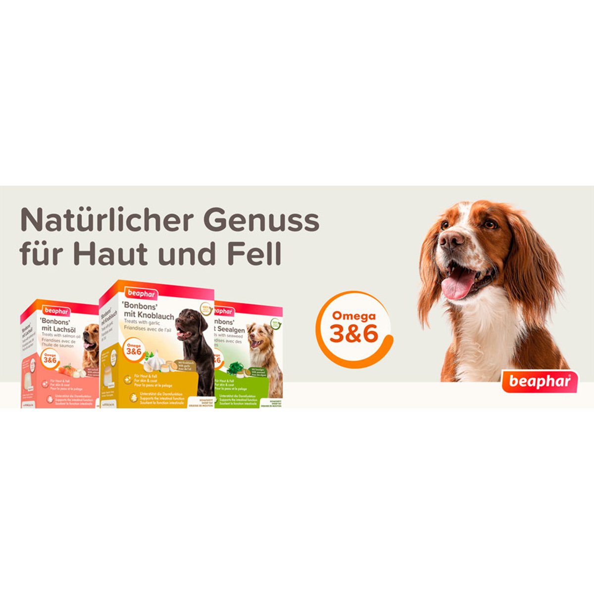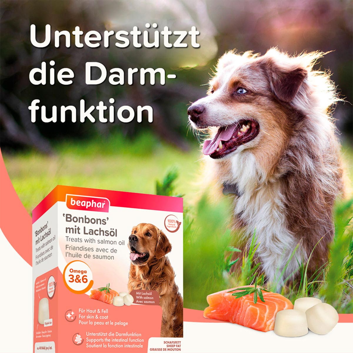 Beaphar 'Bonbons' mit Lachsöl bestehen aus Schafsfett und einer schmackhaften Haube aus Lachsöl. Das Leckerli für Ihren Liebling unterstützt die Haut und das Fell des Vierbeiners dank Omega 3 und 6. Die „Bonbons“ mit Lachsöl sind getreidefrei und haben eine weiche Konsistenz. Der natürliche Hundesnack unterstützt ebenso die Darmfunktion Ihres Vierbeiners.