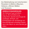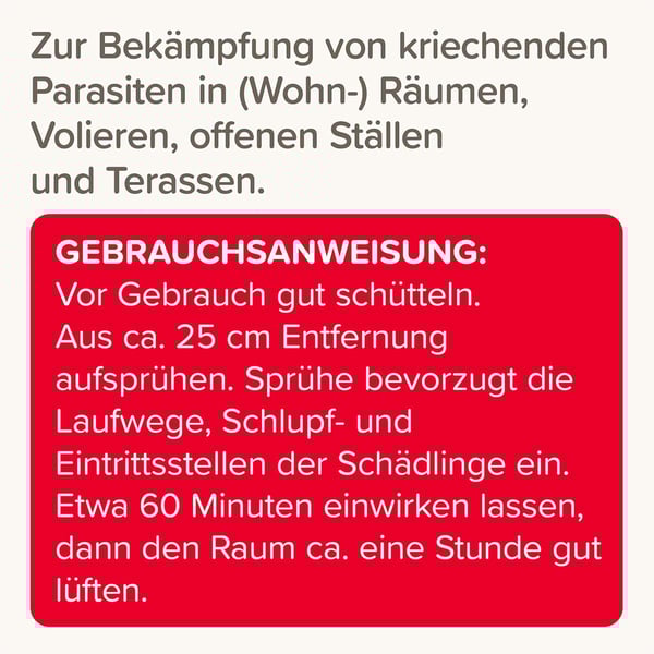 Das Produkt ist ausschließlich zur Abwehr von kriechenden Parasiten in (Wohn-) Räumen, Volieren, offenen Ställen, Terrassen usw. anzuwenden. Sprühe bevorzugte Aufenthaltsorte, Laufwege, Schlupf- sowie Eintrittsstellen der Schädlinge aus ca. 25 cm Entfernung ein. Zudem eignet es sich ideal für die Anwendung in der Umgebung von Haustieren. Sprühe dazu einfach ihre Schlaf- und Aufenthaltsplätze ein. Falls erforderlich, die Anwendung nach zwei Wochen wiederholen. Nicht auf Tiere sprühen, nicht in der direkten Umgebung von neugeborenen Heimtieren anwenden. Bei partieller Anwendung einzelner Stellen im Raum brauchen Tiere nicht entfernt zu werden. Bei einer kompletten Raumbehandlung Tiere entfernen. Ggf. Aquarien abdecken und deren Belüftung ausschalten. Nach der Anwendung den Raum verlassen und Hände waschen. Etwa 1 Stunde einwirken lassen, dann den Raum mindestens 1 Stunde lang gründlich lüften. Stellen, an denen Essen zubereitet wird, abdecken oder nach Versprühen reinigen. Vor Gebrauch gut schütteln. Um evtl. Flecken auf empfindlichen Materialien zu vermeiden, an nicht sichtbaren Stellen ausprobieren.