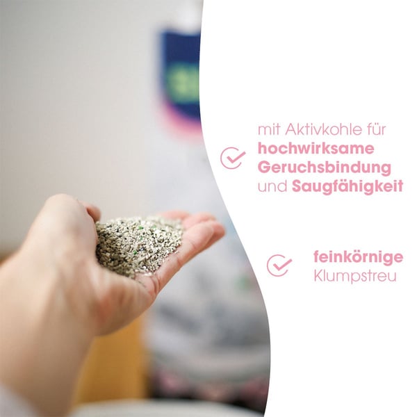 Mit Aktivkohle für hochwirksame Geruchsbindung und Saugfähigkeit - mit Aloe Vera für eine natürliche & sanfte Pflege - Feinkörnige Klumpstreu mit Babypuderduft - 99% staubfrei - Made in Germany.