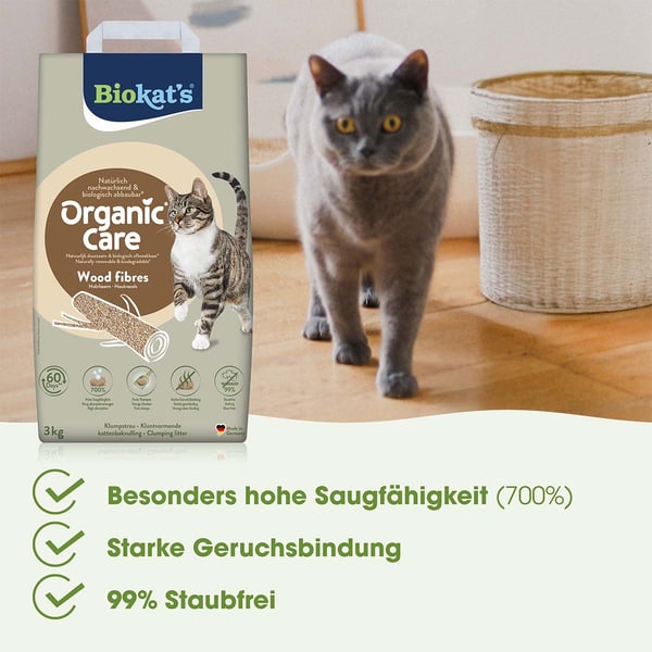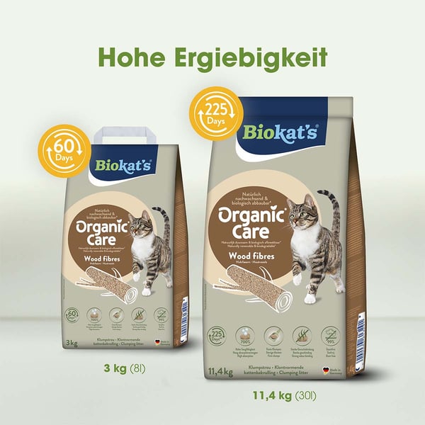 Dank der natürlichen Holzfasern erreichen die Biokat’s Wood fibres eine Saugfähigkeit von 700 Prozent. Dies sorgt für eine hohe Ergiebigkeit, da die Fasern ein Vielfaches ihres Eigengewichts an Flüssigkeit aufnehmen können. Die stabilen Klumpen lassen sich leicht entnehmen, wodurch die Katzentoilette länger sauber bleibt.