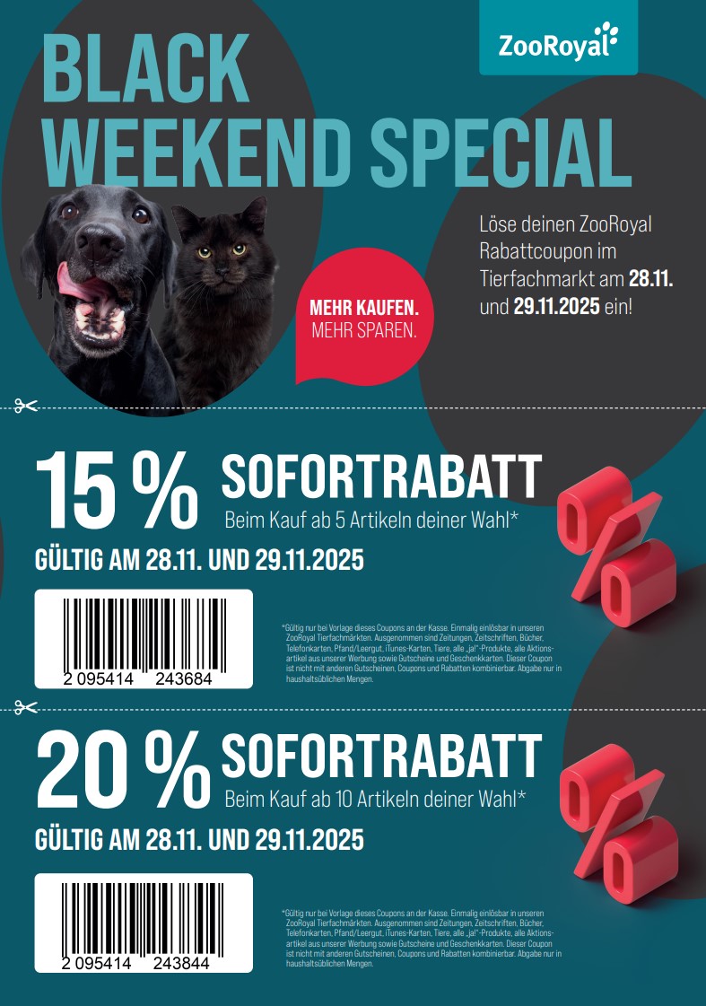 Profitiere von attraktiven Black Weekend Special Rabattcoupons in unseren Tierfachmärkten.