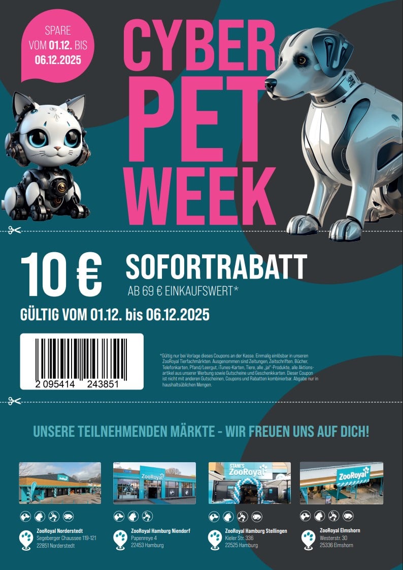 Verpasse nicht die Cyber Pet Week in unseren Tierfachmärkten – 10€ Rabatt ab 69€ Einkaufswert!