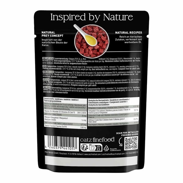 catz finefood Pure Känguru 16x85g bietet deiner Katze ein getreidefreies Nassfutter mit Mono-Protein. Zartes Känguru sorgt für einen unwiderstehlichen Geschmack, den deine Katze lieben wird. Das Futter ist speziell auf die Bedürfnisse von ausgewachsenen Katzen angepasst und eignet sich für Katzen aller Größen. Mit diesem Futter bekommt deine Katze alles, was sie für ein aktives Leben benötigt.