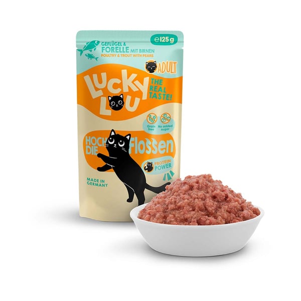 Ihr seht also: Mein Futter gibt es speziell auf unsere verschiedenen Lebensabschnitte und individuellen Bedürfnisse abgestimmt. Langweiligen Einheitsfraß gibt’s woanders – Lucky Lou Lifestage ist in 18 verschiedenen Sorten erhältlich. Damit du deinen Katzen immer frisches Futter servieren kannst, gibt es Lucky Lou Lifestage in Pouchbeuteln mit 125 g Inhalt sowie in Dosen zu 200 g und 400 g. Und Multipacks gibt’s natürlich auch!