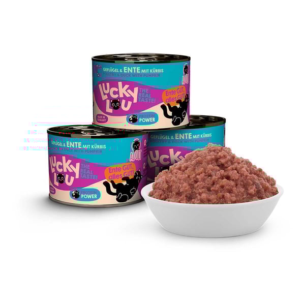 Ihr seht also: Mein Futter gibt es speziell auf unsere verschiedenen Lebensabschnitte und individuellen Bedürfnisse abgestimmt. Langweiligen Einheitsfraß gibt’s woanders – Lucky Lou Lifestage ist in 18 verschiedenen Sorten erhältlich. Damit du deinen Katzen immer frisches Futter servieren kannst, gibt es Lucky Lou Lifestage in Pouchbeuteln mit 125 g Inhalt sowie in Dosen zu 200 g und 400 g. Und Multipacks gibt’s natürlich auch!