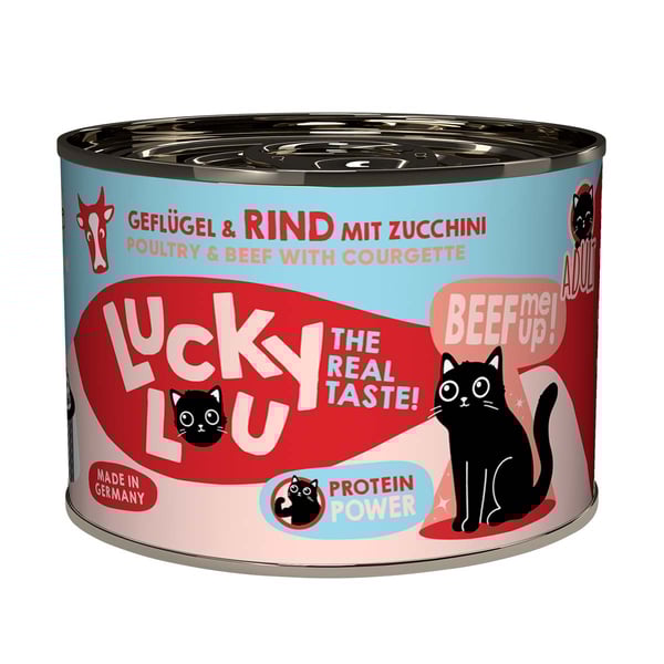 Ihr seht also: Mein Futter gibt es speziell auf unsere verschiedenen Lebensabschnitte und individuellen Bedürfnisse abgestimmt. Langweiligen Einheitsfraß gibt’s woanders – Lucky Lou Lifestage ist in 18 verschiedenen Sorten erhältlich. Damit du deinen Katzen immer frisches Futter servieren kannst, gibt es Lucky Lou Lifestage in Pouchbeuteln mit 125 g Inhalt sowie in Dosen zu 200 g und 400 g. Und Multipacks gibt’s natürlich auch!