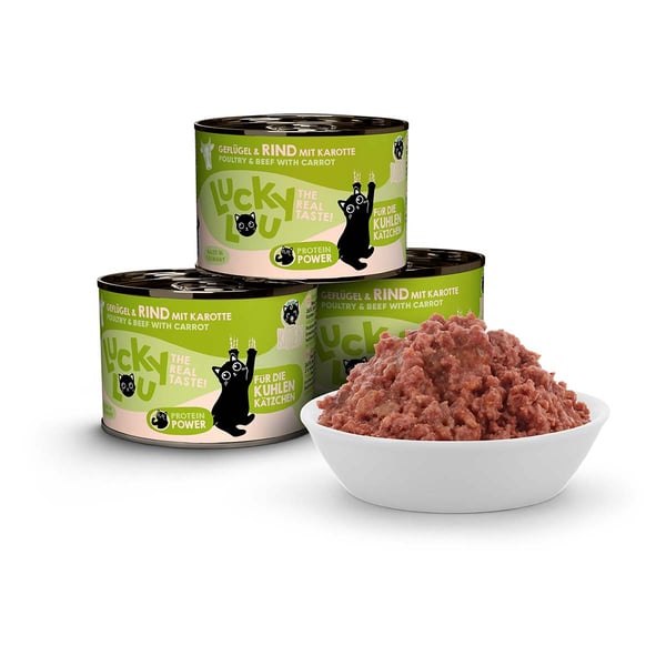 Langweiligen Einheitsfraß gibt’s woanders – Lucky Lou Lifestage ist in 18 verschiedenen Sorten erhältlich. Damit du deinen Katzen immer frisches Futter servieren kannst, gibt es Lucky Lou Lifestage in Pouchbeuteln mit 125 g Inhalt sowie in Dosen zu 200 g und 400 g. Und Multipacks gibt’s natürlich auch!