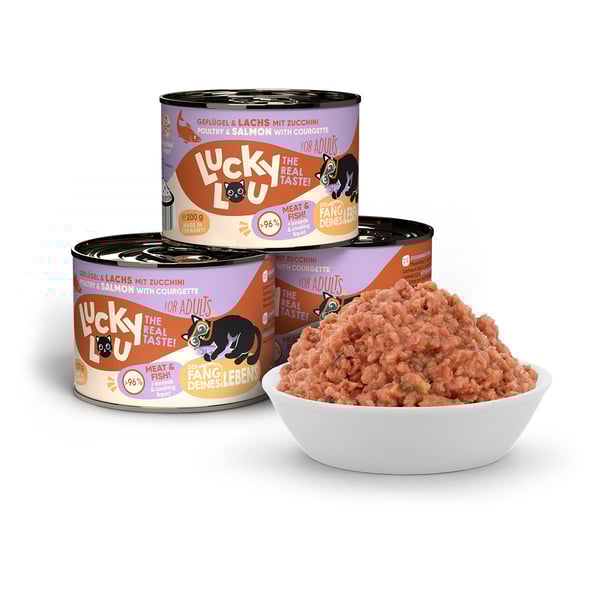 Langweiligen Einheitsfraß gibt’s woanders – Lucky Lou Lifestage ist in 18 verschiedenen Sorten erhältlich. Damit du deinen Katzen immer frisches Futter servieren kannst, gibt es Lucky Lou Lifestage in Pouchbeuteln mit 125 g Inhalt sowie in Dosen zu 200 g und 400 g. Und Multipacks gibt’s natürlich auch!