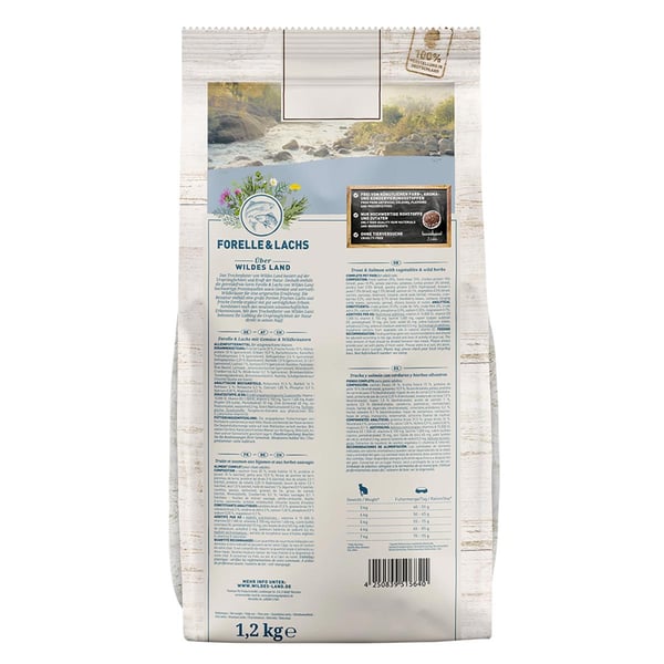 Wildes Land steht für Qualität und Nachhaltigkeit. Das Trockenfutter Forelle & Lachs wird ohne Tierversuche entwickelt und in Deutschland hergestellt. Der vollständig recyclebare Kunststoffbeutel unterstreicht das Engagement für Umweltschutz.
