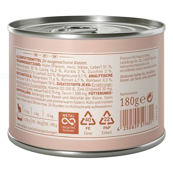 Wildes Land legt Wert auf Qualität und Nachhaltigkeit. Das Ragout Huhn und Lachs wird ohne Tierversuche in Deutschland zubereitet. Die Kombination aus Fleisch, Gemüse und wertvollem Lachsöl bietet eine artgerechte Ernährung, die alle wichtigen Nährstoffe für ein langes, aktives Leben deiner Katze liefert. Natur pur direkt in den Napf deiner Samtpfote.