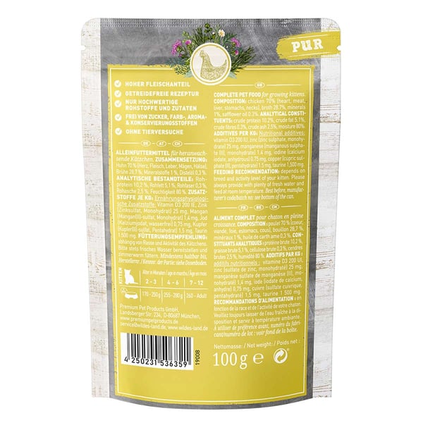 Wildes Land Kittenfutter Huhn PUR wird ohne den Zusatz von Farb-, Aroma- und Konservierungsstoffen hergestellt und ausnahmslos ohne Tierversuche entwickelt. Mit hochwertigen Rohstoffen und Zutaten aus Deutschland kannst du sicher sein, dass dein Kätzchen nur das Beste erhält. Diese hochwertige Nahrung ist für Kätzchen aller Rassen geeignet und bietet eine hohe Akzeptanz.
