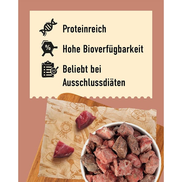 Dieses schonende und einzigartige DIBO Frostfutter besteht aus leicht verdaulichem Pferdefleisch und nahrhaften Innereien, Es ist ideal für Hunde mit Allergien und Unverträglichkeiten, Das mageres Pferdefleisch ist reich an Vitaminen und Mineralstoffen, insbesondere den wasserlöslichen Vitaminen B3, B6 und B12, Es eignet sich als Ausschlussdiät und für futtersensible Hunde, Das Pferdefrostfutter bietet eine schmackhafte und allergenarme Alternative für Hunde mit besonderen Ernährungsbedürfnissen.
