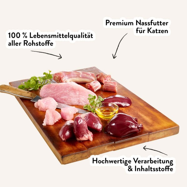 Unser Futter für Katzen kommt ohne unnötiges ChiChi. Der besonders hohe Fleischanteil beinhaltet reines Muskelfleisch und feine Innereien und besonders wertvolles Leinsamenöl liefert gesunde Omega 3 Fettsäuren. Leckere Brühe macht die Mahlzeit besonders saftig und sorgt für einen ausgeglichenen Wasserhaushalt.