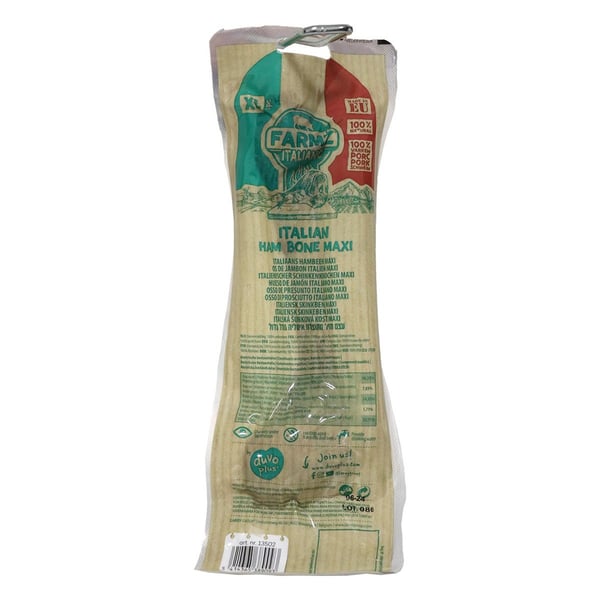 Natural Snack Italian Ham Bone Maxi. Luftgetrockneter Schinkenknochen italienischer Herkunft. Natürlicher Kausnack mit Fleischstückchen. Ein grosser Genuss für jeden Hund. Lange haltbar durch Vakuumverpackung. Kühl und trocken lagern. Grösse: ca. 20cm / Gewicht: mind. 390g / 1 Stück