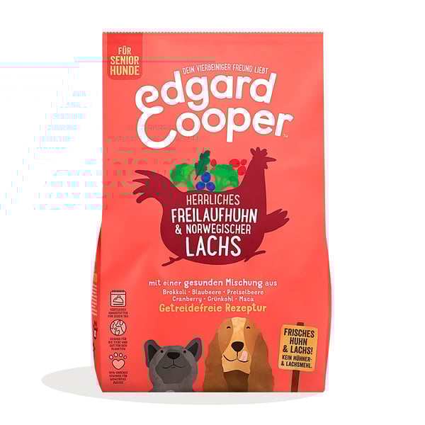 Unsere Rezeptur mit frischem Huhn aus Freilaufhaltung und Lachs ist kalorienarm, getreidefrei und somit perfekt für ältere Hunde. Das liegt daran, dass es voll von magerem Protein ist (und kein Fleisch, das getrocknet oder dehydriert wurde), sowie Süßkartoffeln für eine langsame Energiefreisetzung. Das Rezept enthält Präbiotika für einen gesunden Darm und wir fügen natürliche Extrakte von Glucosamin und Chondroitin hinzu, um die Gelenke flexibel zu halten.Wir bereiten unser Trockenfutter mit einem super gesunden Mix aus Obst und Gemüse sowie einer extra Portion Kräuter zu. Dann wird es schonend gegart, um all das Gute und den Geschmack zu erhalten. Hergestellt in Deutschland.