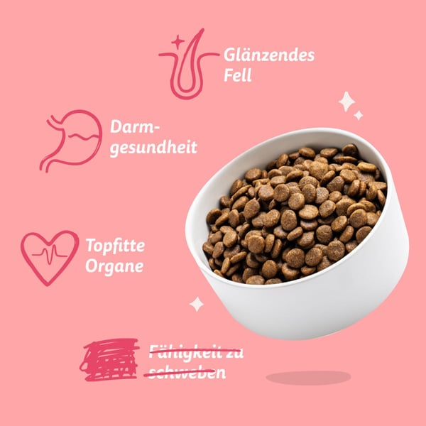 Analytische Bestandteile:Rohprotein 25 %, Rohöle und -fette 14,5 %, Rohfaser 3 %, Rohasche 6,7 %, Omega-6 2,8 %, Omega-3 0,2 %, Calcium 1,1 %, Phosphor 0,75 %.