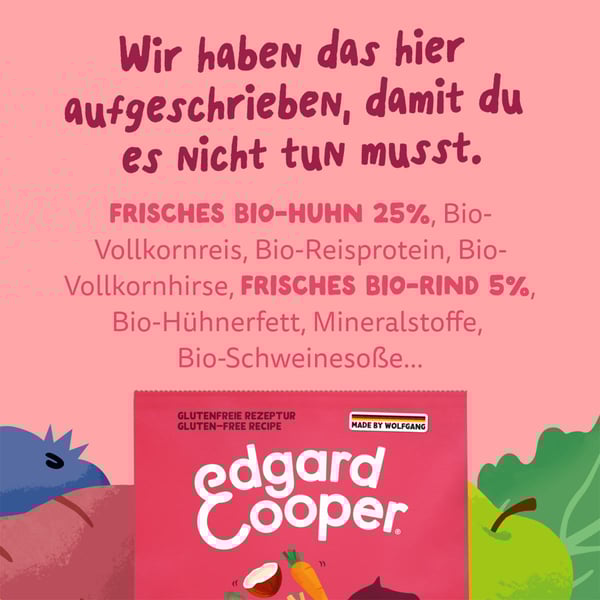 EDGARD & COOPER steht für viel frisches Fleisch, nahrhafte Innereien und einfache Zutaten, nachhaltig zubereitet und verpackt. Ein natürliches, schmackhaftes Hundefutter, mit dem sich du, deine Haustiere und unser Planet wohl fühlen.