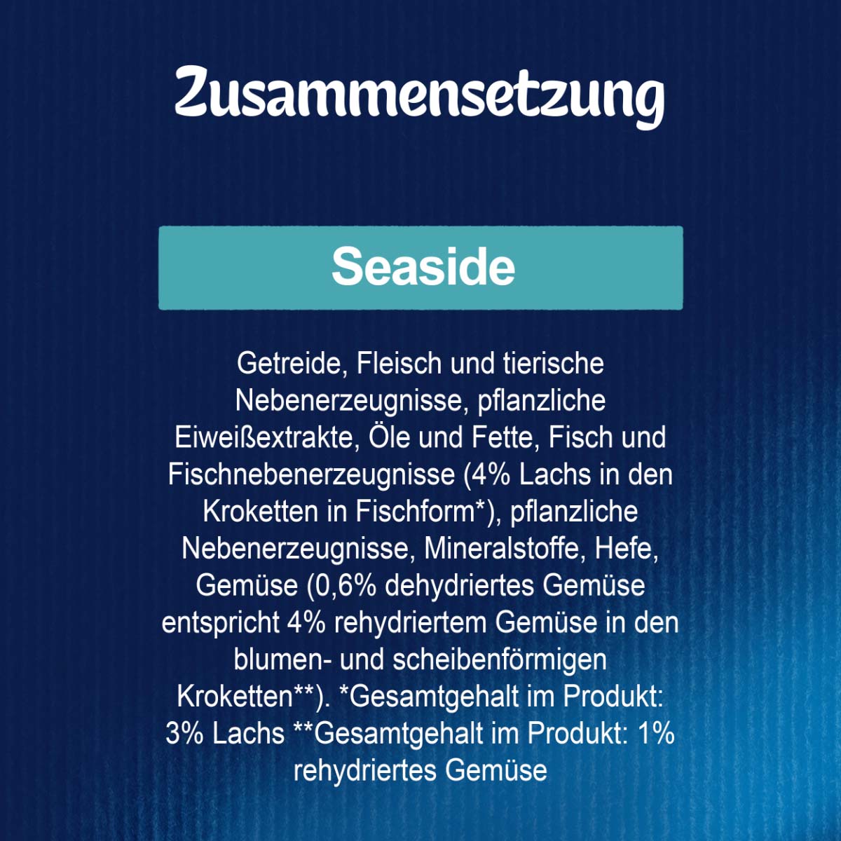 Getreide, Fleisch und tierische Nebenerzeugnisse, pflanzliche Eiweißextrakte, Öle und Fette, Fisch und Fischnebenerzeugnisse (4% Lachs in den Kroketten in Fischform*), pflanzliche Nebenerzeugnisse, Mineralstoffe, Hefe, Gemüse (0,6% dehydriertes Gemüse entspricht 4% rehydriertem Gemüse in den blumen- und scheibenförmigen Kroketten**).