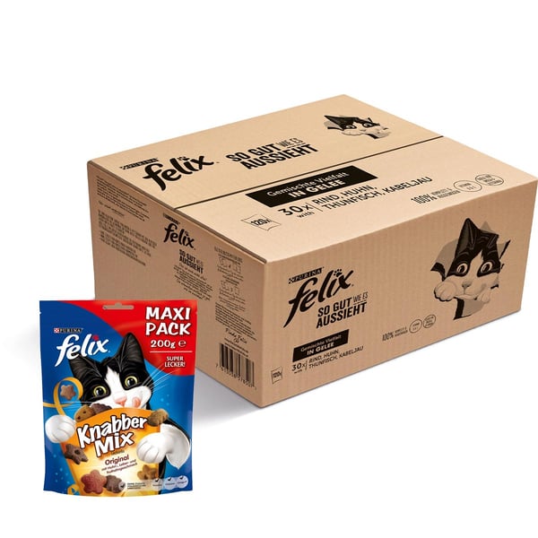 FELIX® So gut wie es aussieht® ist eine Auswahl unwiderstehlicher Mahlzeiten, die so lecker aussehen, riechen und schmecken, als hättest du sie selbst zubereitet. Jede Sorte, hergestellt mit hochwertigen Zutaten, besteht aus zarten Stücken in Gelee für eine leckere Mahlzeit, die deine Katze lieben wird! FELIX® So gut wie es aussieht® ist in einer großen Auswahl leckerer Sorten in saftigem Gelee erhältlich, um deiner Katze jeden Tag die Abwechslung zu geben, die sie liebt. Sie schmecken wirklich so gut, wie sie aussehen! FELIX - einfach unwiderstehlich!