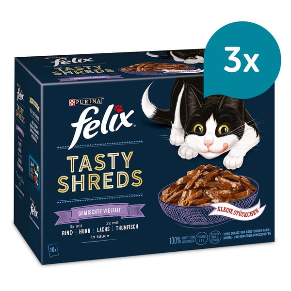 FELIX Katzenfutter Tasty Shreds sind zarte und unwiderstehliche kleine Stückchen in einer leckeren Sauce, die Ihr kleiner Racker lieben wird! Die Katzennahrung sieht einfach fantastisch aus und riecht und schmeckt unglaublich gut - fast so als hätten Sie selbst gekocht! Alle Sorten werden bei genau der richtigen Temperatur zubereitet und dann in zarte Streifen geschnitten, bevor sie in einer unwiderstehlichen Sauce serviert werden.