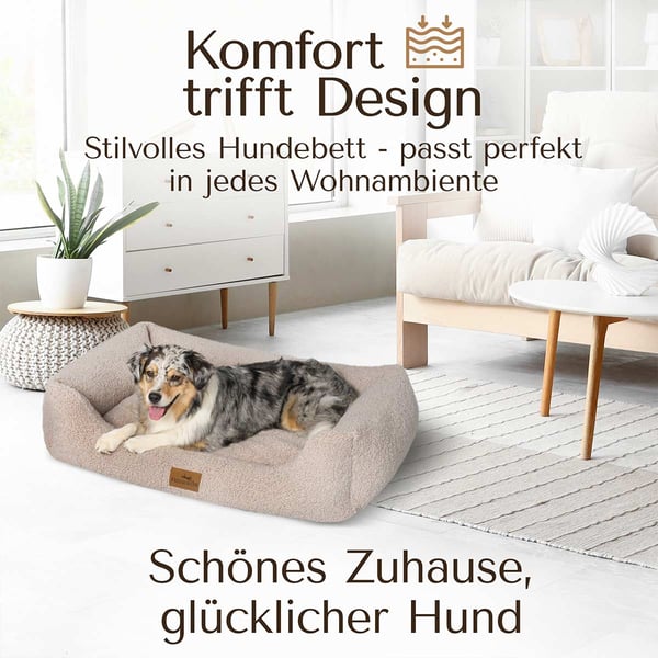Neben dem Komfort besticht das Hundebett durch sein zeitlos schönes Design, das sich perfekt in jedes Zuhause einfügt. Die handgefertigte Qualität aus Europa garantiert Langlebigkeit und Formstabilität. Bei Bedarf kannst du den Bezug einfach abziehen und bei 30 Grad waschen, sodass das Bett stets sauber und frisch bleibt.