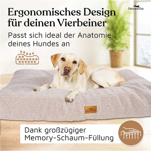 Das Freudentier orthopädische Hundekissen aus Teddy bietet deinem Hund eine unvergleichliche Kombination aus Komfort und Geborgenheit. Die druckentlastenden Eigenschaften des Memory Foams passen sich optimal an den Körper deines Hundes an und sorgen für einen erholsamen Schlaf. Der kuschelige OEKO-TEX Teddystoff lädt zum Einkuscheln ein und schafft eine wohlig warme Umgebung, in der sich dein Hund sicher und geborgen fühlt. So wird jeder Schlaf zu einem entspannenden Erlebnis.