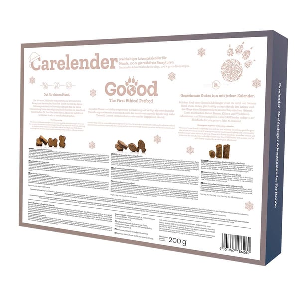 Was gibt es Passenderes als ein Adventskalender in der Vorweihnachtszeit? Damit auch dein Liebling in den Genuss dieser leckeren Tradition kommt, gibt es jetzt den Goood Carelender. Hinter den 24 Türchen des Goood Adventskalenders verstecken sich leckere, getreidefreie Gooodies in verschiedenen Formen und Geschmacksrichtungen. Mit den täglichen Snacks versüßt du deiner Fellnase garantiert die Vorweihnachtszeit. Jeder Goood Carelender sorgt nicht nur für die perfekte Weihnachtsstimmung bei dir und deinem Hund, sondern unterstützt gleichzeitig den Anbau und die Pflege einer Bienenweide in unserer bayerischen Heimat. Diese Blühflächen bieten Bienen, Käfern und Wildtieren Lebensraum und Schutz zugleich. Jeder Kalender sichert 1 qm Blühfläche für ein ganzes Jahr!
