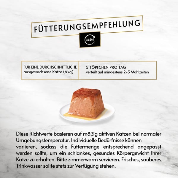 Jede delikate und feine Mousse wird mit qualitativ hochwertigen Zutaten hergestellt und mit einer köstlichen Sauce überzogen, um Ihrer Katze ein exquisites kulinarisches Genusserlebnis zu bieten. Das Katzennassfutter befindet sich zudem in einer leicht zu öffnenden Verpackung, die zum Recyceln bestimmt ist.