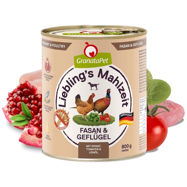 GranataPet Liebling's Mahlzeit Fasan und Geflügel bietet deinem Hund eine schmackhafte und ausgewogene Ernährung. Dieses hochwertige Nassfutter ist speziell für übergewichtige Hunde konzipiert und hilft dabei, das Idealgewicht zu erreichen. Die Kombination aus Fasan und Geflügel sorgt für eine leckere Mahlzeit, die auch den zartesten Gaumen verwöhnt.